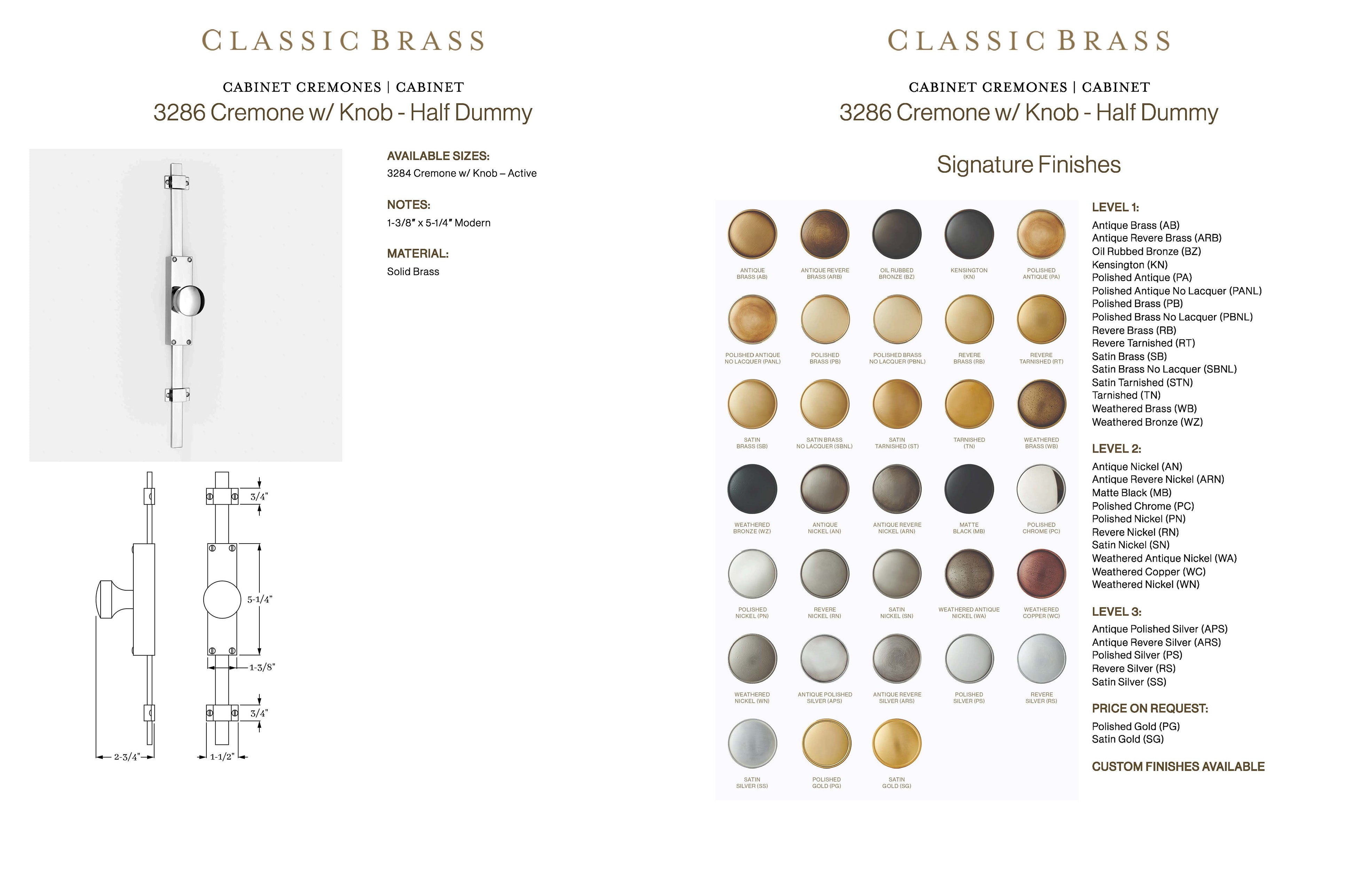 3286, Cabinet Cremone w/ Knob - Half Dummy - 1-3/8" x 5-1/4" Modern, Cabinet Cremones